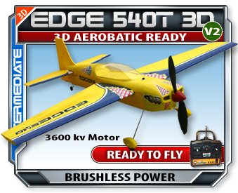 New Improved! The Edge 540T Version 2 Now featuring our new brushless inner runner 3600kv motor with gear drive for 30% More Power, New 11x4.7 "No Flex" Resin Prop and Larger Battery Bay to hold larger capacity Li-poly batteries, and New! advanced Li-poly Battery 2 and 3 cell peak charger included.The Edge 540T 2 is a true scale brushless 3600kv inner runner powered Ready To Fly full 3D r/c aircraft. Capable of limited vertical performance including hovering, knife edge, rolls , inverted flight and much more. Featuring our new motor for even better hovering and 3D maneuvers. Included everything needed to fly : 2.4 Ghz Radio and Rx, 3 cell 11.1 volt Li-Poly 1800 mah battery, 90 Minute balanced peak charger, 3 Servos, Speed Control, all pre-installed from factory. Edge features plug and play construction for easy maintenance and disassembly. Kit comes full stickered as seen in photo.